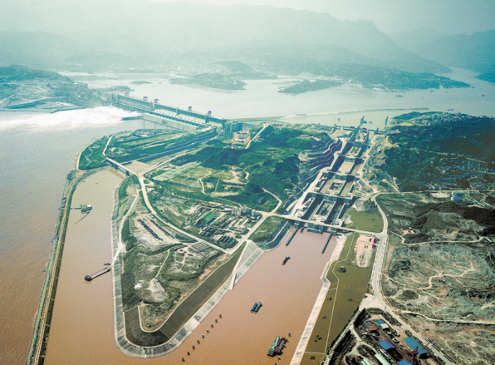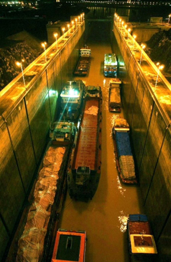 •   三峽大壩上下游之間水位的最大落差達113米,船舶從下游駛往上游(或從上游駛往下游),必須通過三峽船閘或垂直升船機。人們形象地比喻船舶通過三峽船閘過壩是“爬樓梯”,船舶乘垂直升船機過壩是“坐電梯”。